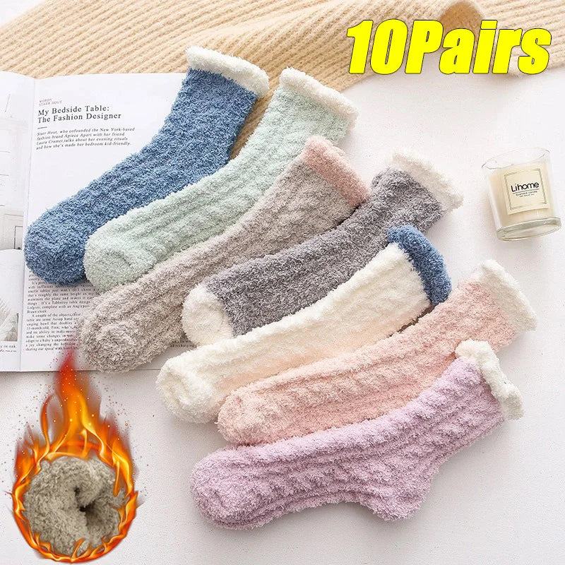 10 Paare Winter-Baumwollsocken | Warme Dicke Haussocken | Flauschige Plüsch-Socken in Wadenhöhe für Herbst & Winter