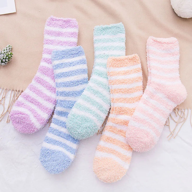Damen Herbst & Winter Gestreifte Korallenfleece-Schlafsocken | Dicke Warme Wadenlange Haussocken