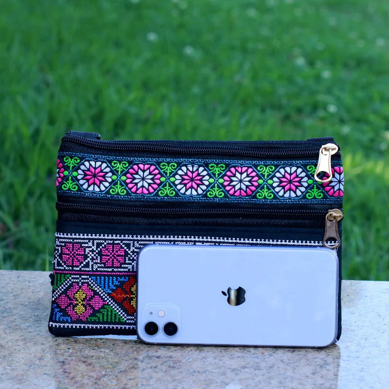 Bestickte Umhängetasche – Damen Schultertasche mit Drei-Lagen-Reißverschluss | Handy- & Münztasche