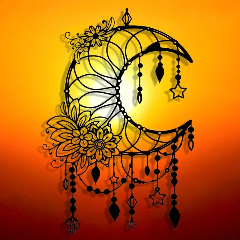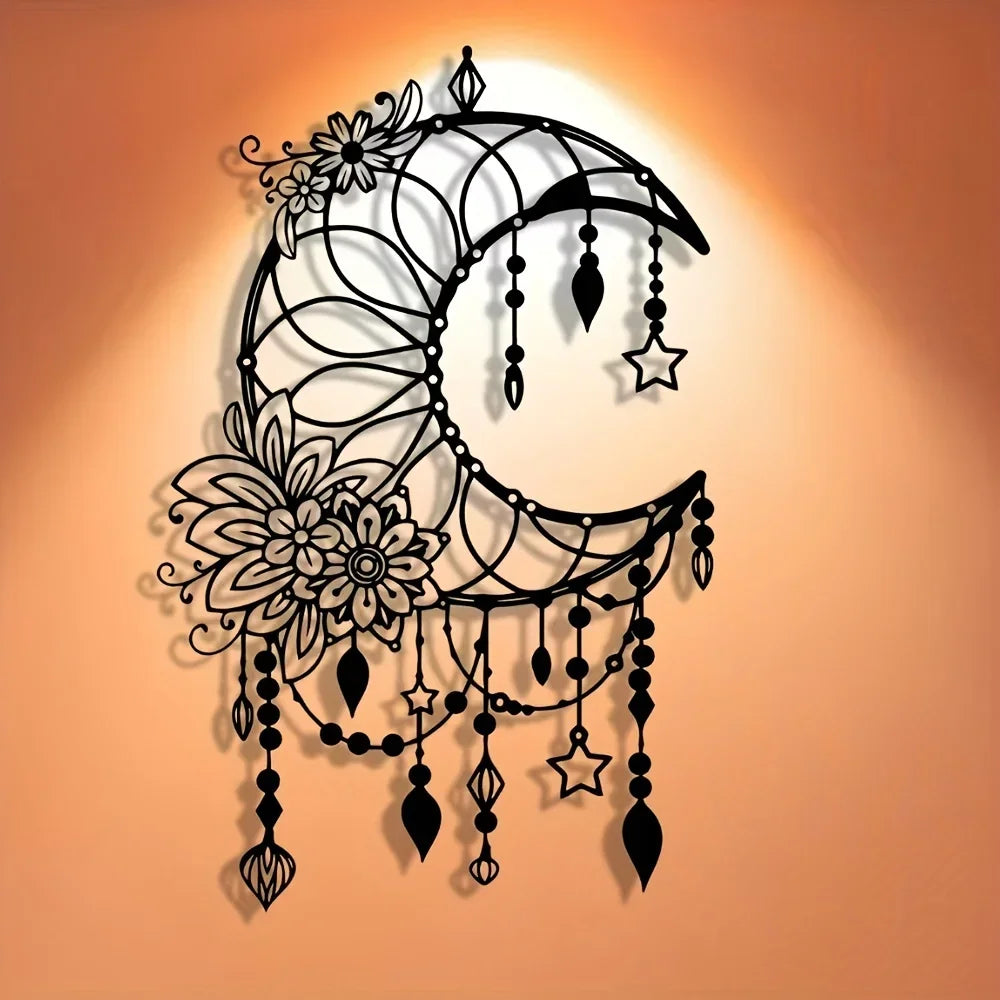 Elegantes Gothisches Mond & Blumen Metall Wandbild – Modernes Hängedekor