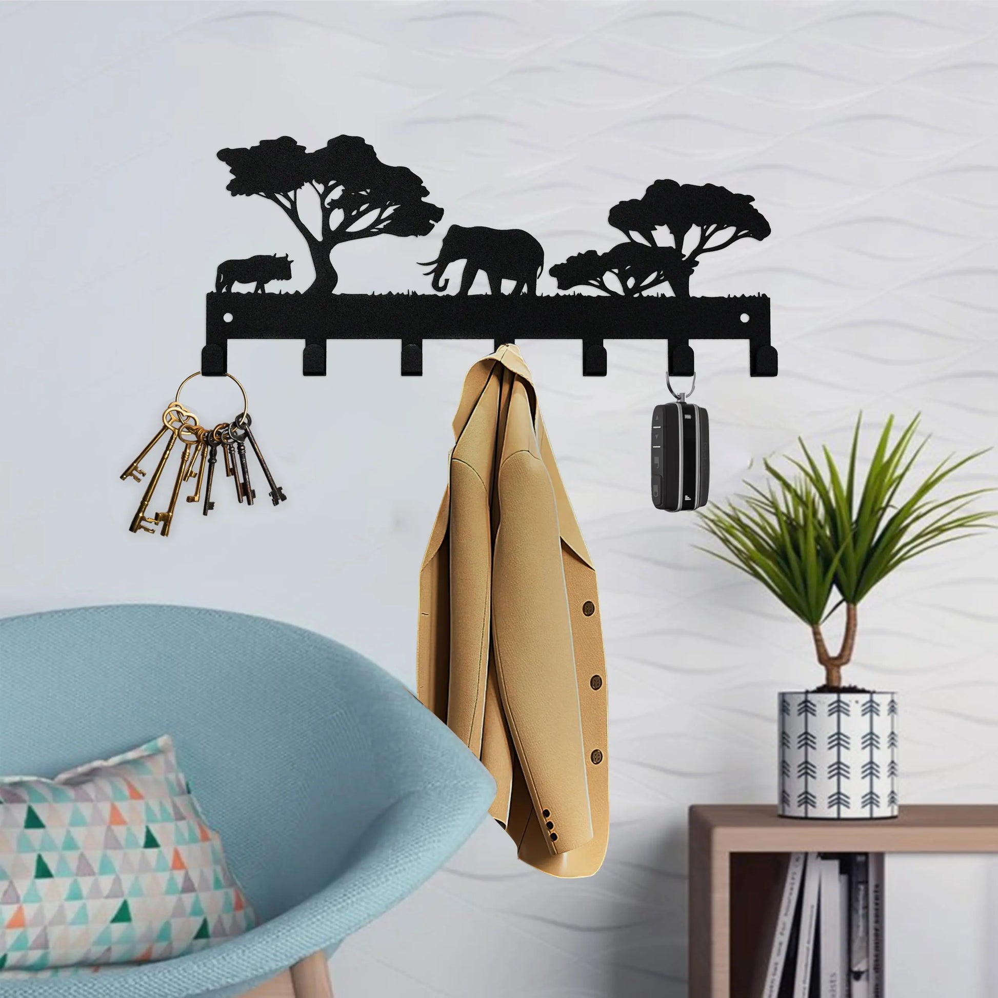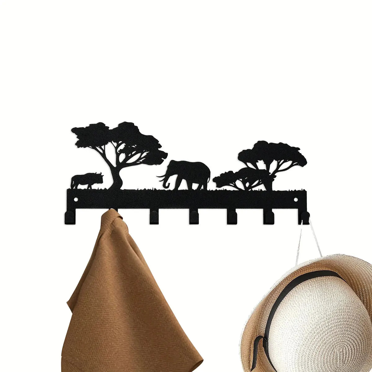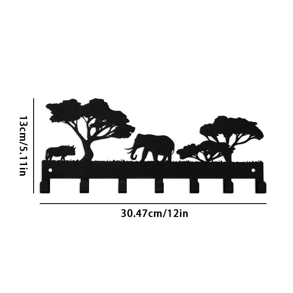 Dieser Schlüsselhalter mit Elefantenmotiv kombiniert exotisches Design mit Funktionalität. Aus robustem schwarzen Eisen gefertigt und mit 7 stabilen Haken ausgestattet, bietet er ausreichend Platz für Schlüssel, Taschen, Handtücher oder Accessoires.