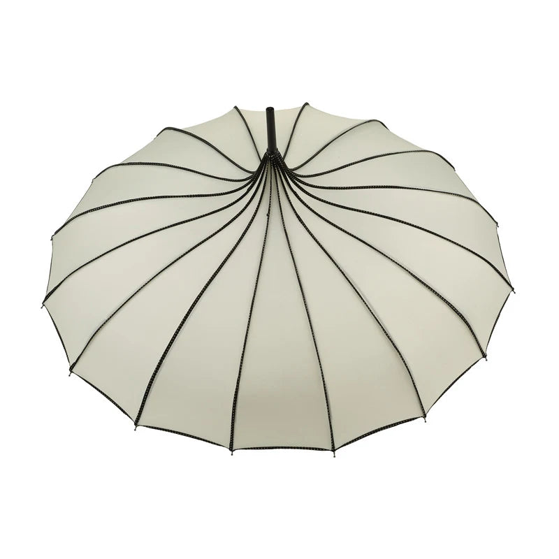 Der Schirm verfügt über 16 robuste Streben, die außergewöhnliche Stabilität bieten. Selbst bei leichtem Wind oder Regen behält der Schirm seine elegante Form.